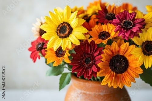 Vibrant bouquet of sunflowers and daisies in warm autumnal colors.