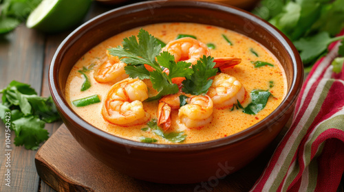 vibrant bowl of traditional Thai shrimp soup, featuring fresh shrimp, aromatic herbs, and rich coconut broth. This dish is delightful blend of flavors and colors