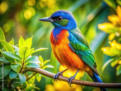 Vibrant California Bird Perched on a Branch Amidst Lush Green Foliage in a Sunny Environment