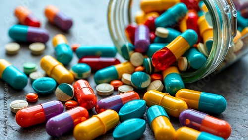 pill, jar, spilling, medication, pharmaceutical, health, health care, vitamin, supplement, chemist's shop, vivid colors, variety, closeup, pharmacy, prescription, over-the-counter, wellness, nourishment, bottle, container, medicals, treatment, make well, lifestyle, pharmaceutical industry, vibrant, medicine cabinet