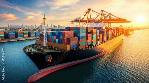 Vibrant Cargo Ship at Sunset in Busy Harbor