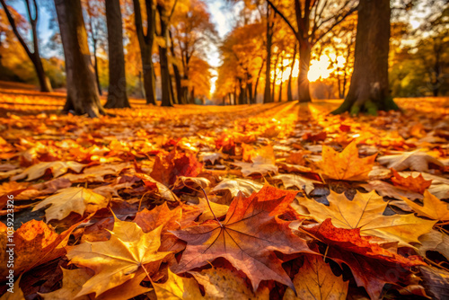 vibrant carpet of autumn leaves blankets ground, showcasing shades of orange and yellow as sun sets behind trees, creating warm and inviting atmosphere