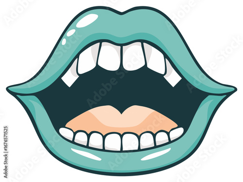 Vibrant cartoon drawing of a wide open mouth with teal lips and clean white teeth