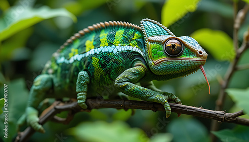 Vibrant Chameleon Perched on Branch Amid Lush Green Foliage in a Dense Forest Setting