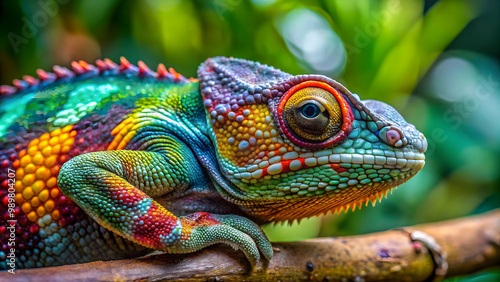 vibrant chameleon perches on a branch, its multicolored scales glistening in the natural light.