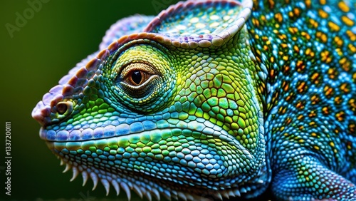 Vibrant chameleon with stunning colors and intricate patterns in a close-up shot.