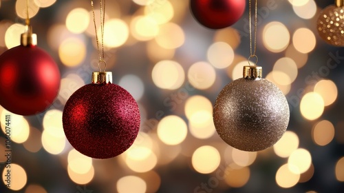 Vibrant Christmas balls adorned with glittering ornaments shine against soft bokeh lights in a festive blur.