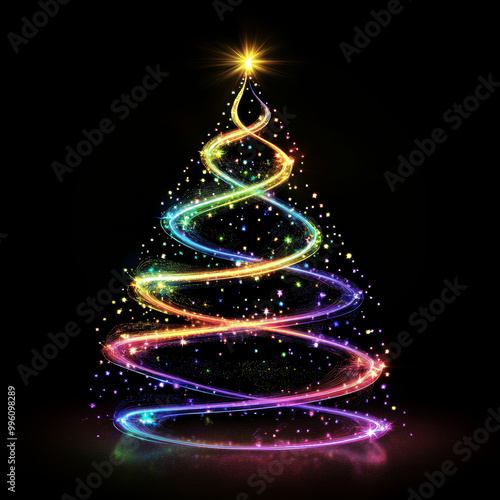 vibrant Christmas tree adorned with colorful lights and sparkling effects, creating magical holiday atmosphere. swirling design adds whimsical touch to festive season