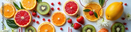 slice, leaf, alimentary, delicious, variety, pattern, vitamin, colourful, tropical, organic, lemon, redcurrant, kiwi, summer, background, healthy, zest, lemony, array, arrangement, orange, mix, decor, snack, natural, assorted, fresh, juicy, strawberry, citrous, refresh, grapefruit, diet, white, greenery, bright, berry, fruit, sweet, lively, vibrant, food