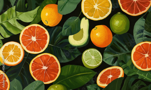 Vibrant Citrus and Tropical Fruit Painting with Lush Green Botanical Elements