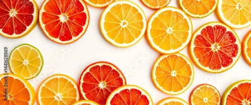 Vibrant citrus fruit slices arranged in a colorful pattern on white, fruit, overhead