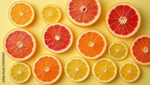 Vibrant Citrus Fruits Arranged Harmoniously on a Yellow Background Highlighting Their Vivid Colors and Textures