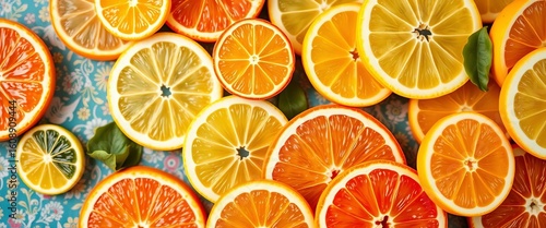 Vibrant citrus rounds, oranges & lemons, thinly sliced, colorful background, ingredient, collage