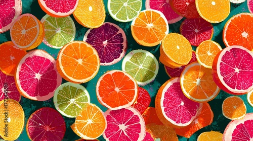Vibrant citrus slices create a refreshing and colorful pattern, perfect for summer designs and healthy food concepts with oranges, limes, and grapefruits