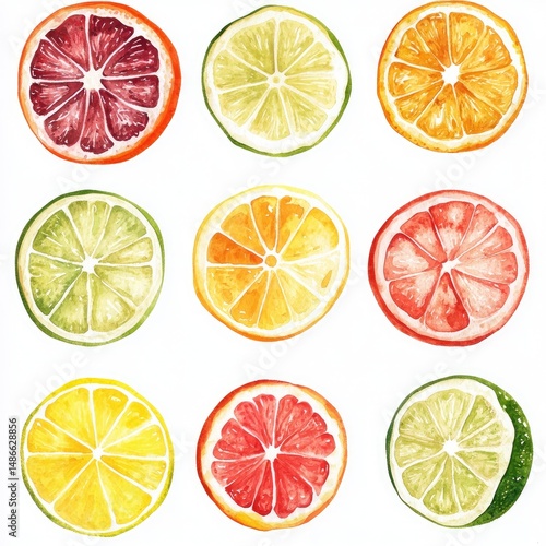 Vibrant citrus slices in a grid pattern. Colorful cross-sections of various citrus fruits, including grapefruit, orange, lime, and lemon. Watercolor style with a bright and fresh aesthetic