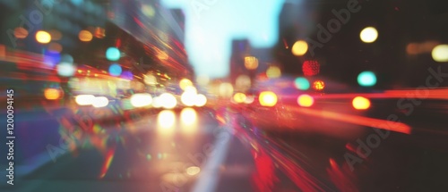 Vibrant city lights create dynamic lens flare and motion blur effects at dusk