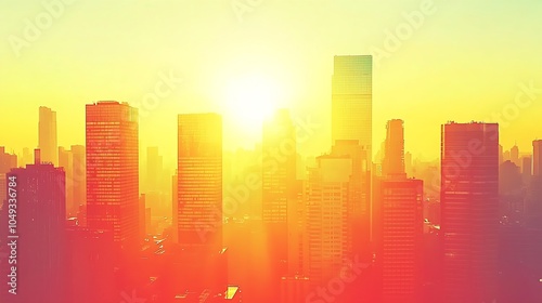 Vibrant City Skyline at Sunrise with Colorful Skyscrapers and Sunlight : Generative AI