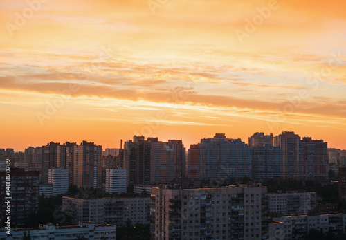 Vibrant city skyline during sunset with colorful clouds reflecting over urban buildings