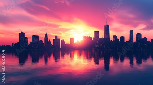 Vibrant city skyline glowing at sunset with water reflection high resolution picture