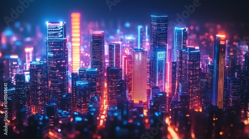 Vibrant city skyline illuminated at night, modern architecture.