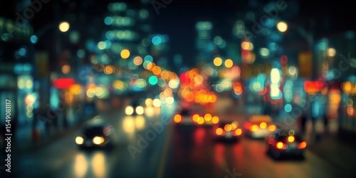 Vibrant City Street at Night with Moving Vehicles and Bright Light Reflections