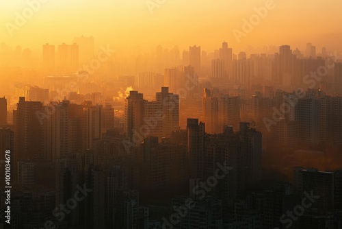city landscape, skyline, skyscraper, urban, architecture, sunset, dusk, golden hour, haze, smog, pollution, modern, tower block, downtown, metropolitan, panoramic, scenic, landscape, dramatic, moody