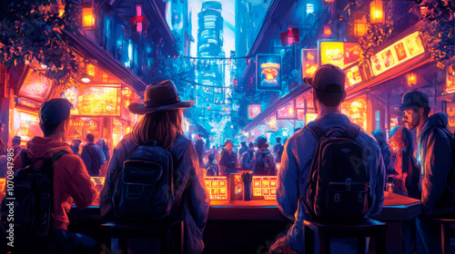 Vibrant cityscape bustling with nightlife and neon lights, featuring travelers at a bar enjoying the urban glow.