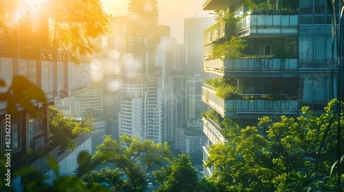 Vibrant Cityscape with Gleaming Skyscrapers and Lush Greenery at Sunrise or Sunset