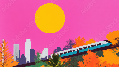 city landscape, train, sun, vibrant, abstract, urban, silhouette, skyline, building, pink, yellow, foliage, nature, journey, horizon, architecture, transport, travel, bright, outdoors, landscape, scene, creative, dynamic, bold, graphic, contrast, sunset, sunrise, geometry, style, energy, watercolor