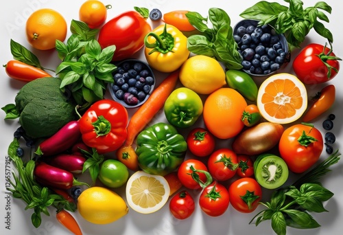 vibrant close fresh ingredients pure white background showcasing colorful herbs culinary inspiration, avocado, basil, berry, broccoli, carrot, caper