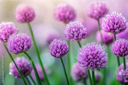 Vibrant close-up of blooming chive flowers with dew drops, set against a soft-focus garden background, showcasing nature's beauty and tranquility in a serene outdoor setting