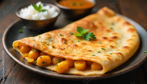 Vibrant close-up of masala dosa with coconut chutney and sambar, served on a steel plate