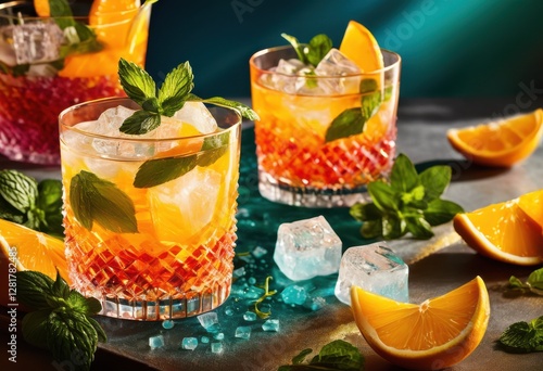 vibrant cocktail ingredients artfully displayed lively colorful backdrop capturing refreshing visual appeal, drink, beverage, bottle, glass, garnish, ice