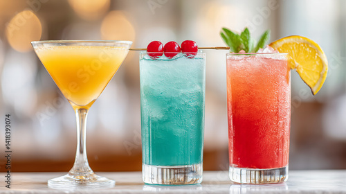 cocktail, drink, beverage, alcohol, bar, summer, refreshment, glasses, party, fruit, orange, red, blue, yellow, mint, cherry, cold, closeup, ice, celebration, tropical, sweet, delicious, colourful, garnish, juice, lifestyle, happy, fun, eatery, gathering, celebrate, alcoholism, refresh, tasty, holiday, event, social, fancy
