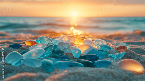 vibrant collection of colorful sea glass sparkles on the sandy beach at sunset, symbolizing transformation, resilience, and the beauty of nature's artistry. A serene ocean travel and summer escape sce