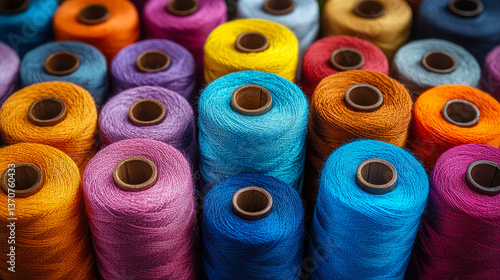 Vibrant Collection of Colorful Thread Spools, Close-Up of Assorted Sewing Threads for Creative Projects and Textile Design, Bright Craft Supplies