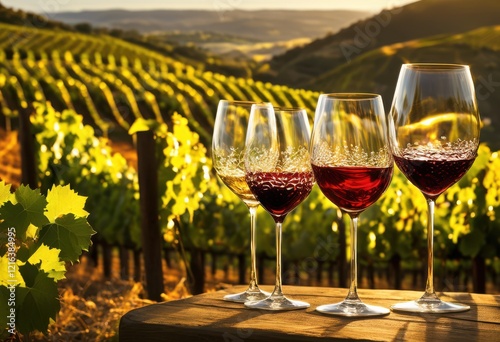 vibrant collection wine glasses set breathtaking vineyard landscape lush grapevines rolling hills background, grapes, scenery, countryside, sunlight
