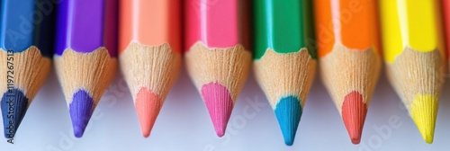 Vibrant colored pencils arranged in a row showcase their pointed tips on a clean white background suitable for creativity. Generative AI