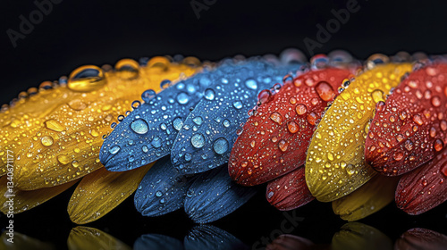 flower petals, water, droplet, colourful, nature, closeup, macro, yellow, blue, red, texture, freshness, garden, floral, detail, bright, wet, natural, beauty, background, decoration, spring, summer, vibrant, flora, botanical, leaf, pattern, design, artistic, photo, high-coloured, shine, moisture, surface, arrangement, aesthetic