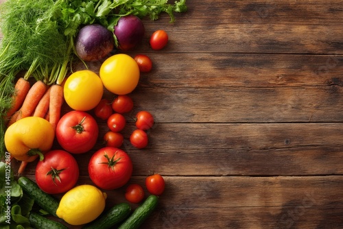 vibrant colorful assortment of fresh vegetables and fruits arranged on rustic wooden table surface with ample copy