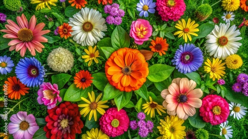 Vibrant colorful flowers surrounded by lush green grasses and leaves fill the frame in a stunning top-down composition.