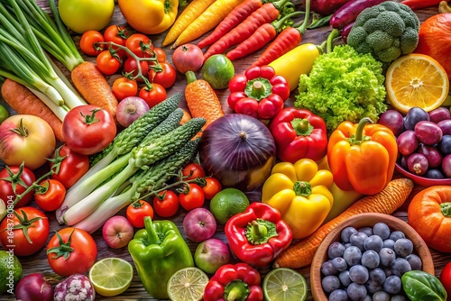 fruit, vegetable, health food, colourful, red, orange, yellow, green, purple, healthy eating, diet, nourishment, fresh produce, organic food, farm fresh, wood background, topview, still life, food photography, bell pepper, carrot, tomatoes, apple, grape, blueberry, broccoli, lettuce, green onion, lime, courgette, gourd, healthy lifestyle, natural food, abundance, bounty, delicious, appetising, bright, juicy, fresh, raw, closeup