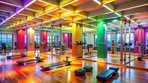 Vibrant colors and dynamic lighting illuminate an empty bright studio with exercise equipment and mirrors, evoking a sense of energy and fitness inspiration.