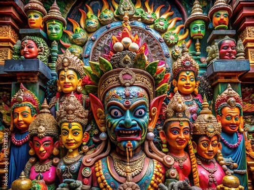 Vibrant colors depict an ornate shrine dedicated to ancient deities, featuring intricately carved masks, mythical