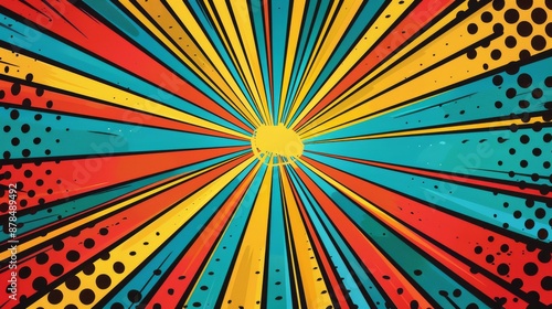 Vibrant comic book background with colorful radial stripes bursting towards center, featuring halftone dots