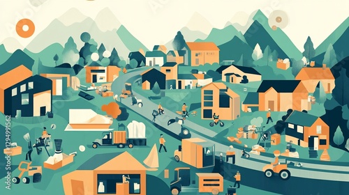 community, house, moving, renovation, people, vehicle, landscape, tied-up, building, activity, illustration, village, home, work, mountain, environment, truck, construction, machinery, men at work, transport, delivery, street, path, architecture, urban, design, neighbourhood, resident, residential, lifestyle, nature, graphic, artistic, digital, geometric, cartoon, animation, style