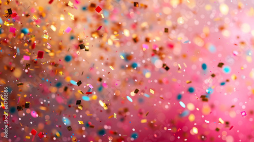 Vibrant confetti in various colors falling gently from the sky, creating a festive and joyful atmosphere