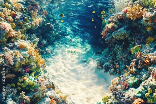 Vibrant coral reef teeming with colorful fish and diverse marine life in a sunlit underwater scene.