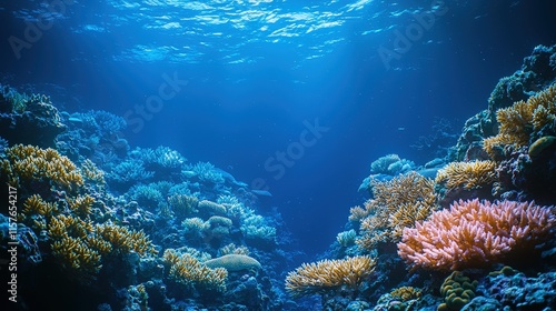 Vibrant coral reef underwater scene with sunlight filtering through the ocean waves