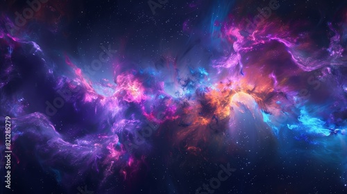 Vibrant cosmic nebula with colorful interstellar clouds in deep space, showcasing a mesmerizing blend of purples, pinks, blues, and oranges.